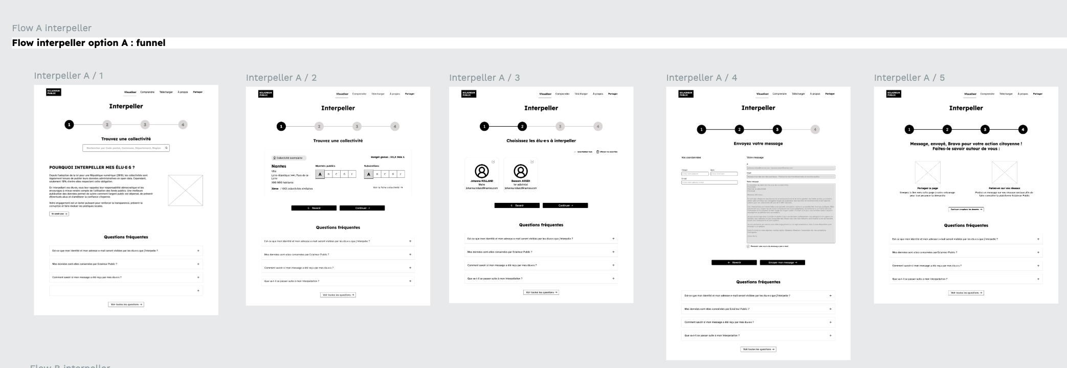 Le parcours interpeller est proposé sous forme de funnel avec intégration d’un message préenregistré et proposition des élus à interpeller.